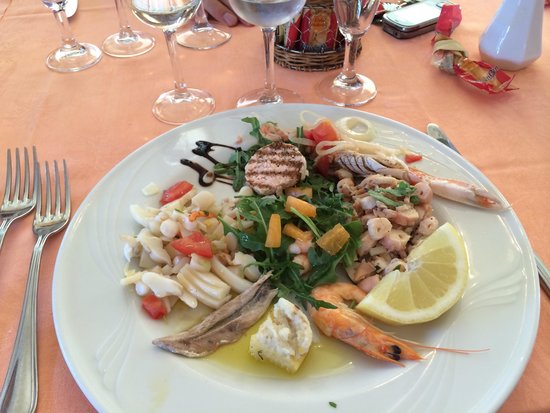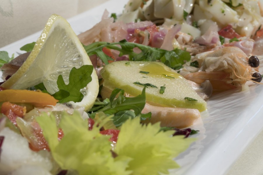 • Antipasti: insalatina di polipo con patate e olive taggiasche + sardoncini marinati + carpaccio di pesce spada al pepe rosa + julienne di seppia ai mille colori + insalata di gamberetti melanzana fritta e ricotta salata